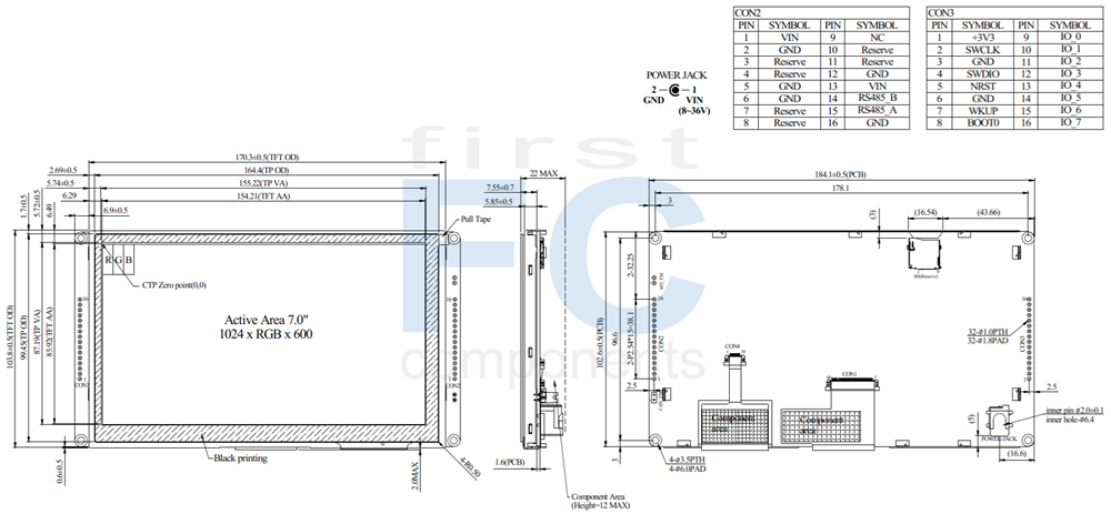 TFT 7" 1024x600, RS485 ModBus interface & GPIO Support, 32MB Flash Memory, 450cd/m², Wide View Angle (IPS), Capacitive touch panel (GG)