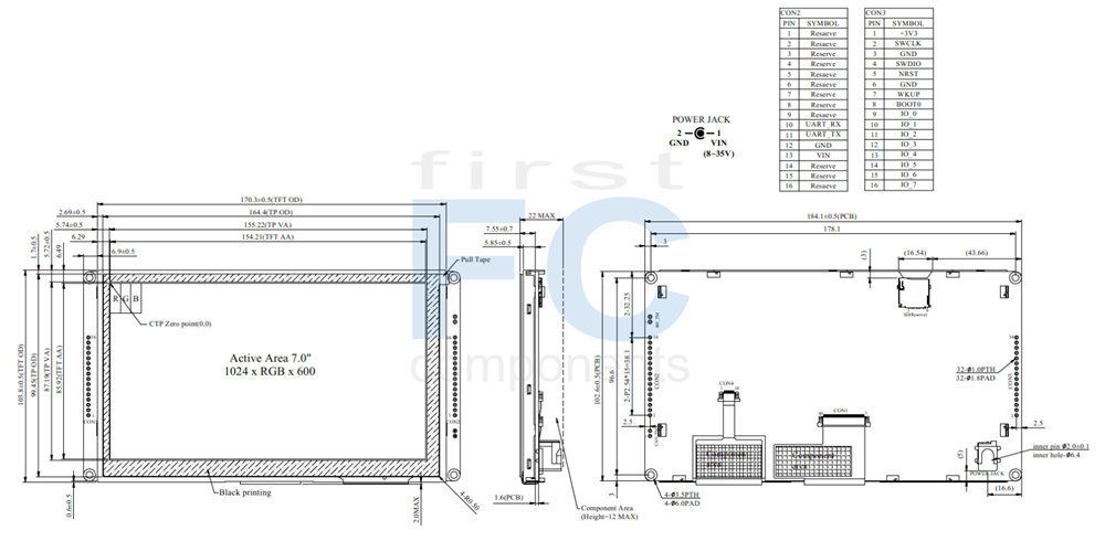 • +12V power supply input with 8V to 35V dynamic range power input, the power consumption is around 6 Watt.