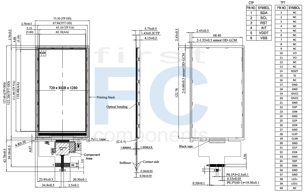 TFT 5" 720x1280 Portrait LCD Panel, Interface MIPI DSI IC ILI9881C, High brightness 900cd/m², Wide View Angle (IPS), Capacitive touch panel I2C interface (GG, GT928 IC), Optical Bonding (OCA)