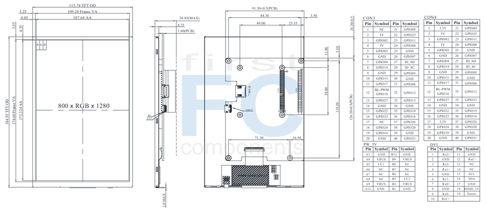 TFT 8" 800x1280, HDMI (only DVI signal), IC LT6911C, Wide View Angle (IPS), High Brightness 1125cd/m², Standard Temp., Incl. 2 connectors, No touch, Suitable for Raspberry Pi 1~3 & Pi3B+ versions