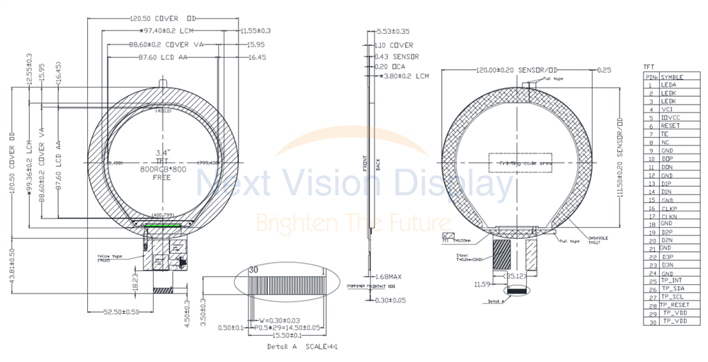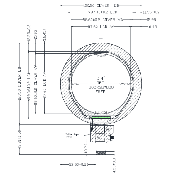 TFT 3.4" 800x800, Round LCD Panel, Interface MIPI, IC ILI9881C, Wide View Angle (IPS), 350 cd/m², Standard Temp., Capacitive touch panel I2C interface (GFF, GT911 IC)