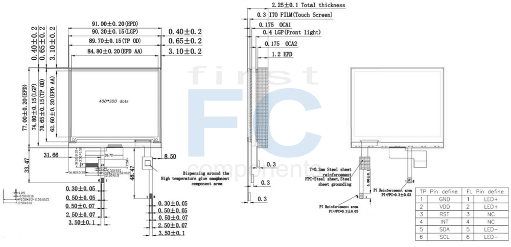 The WAA0420BB5#A2N4AA-FC is a 4.2-inch Electronic Paper Display (EPD) module featuring a front light panel and capacitive touch functionality. This display supports 1-bit black-and-white image rendering with a resolution of 400×300 pixels. It is built on a TFT backplane that drives the electrophoretic layer, and integrates a variety of functional circuits including gate driver, source driver, MCU interface, timing controller, oscillator, DC-DC converter, SRAM, LUT, and VCOM generator.
